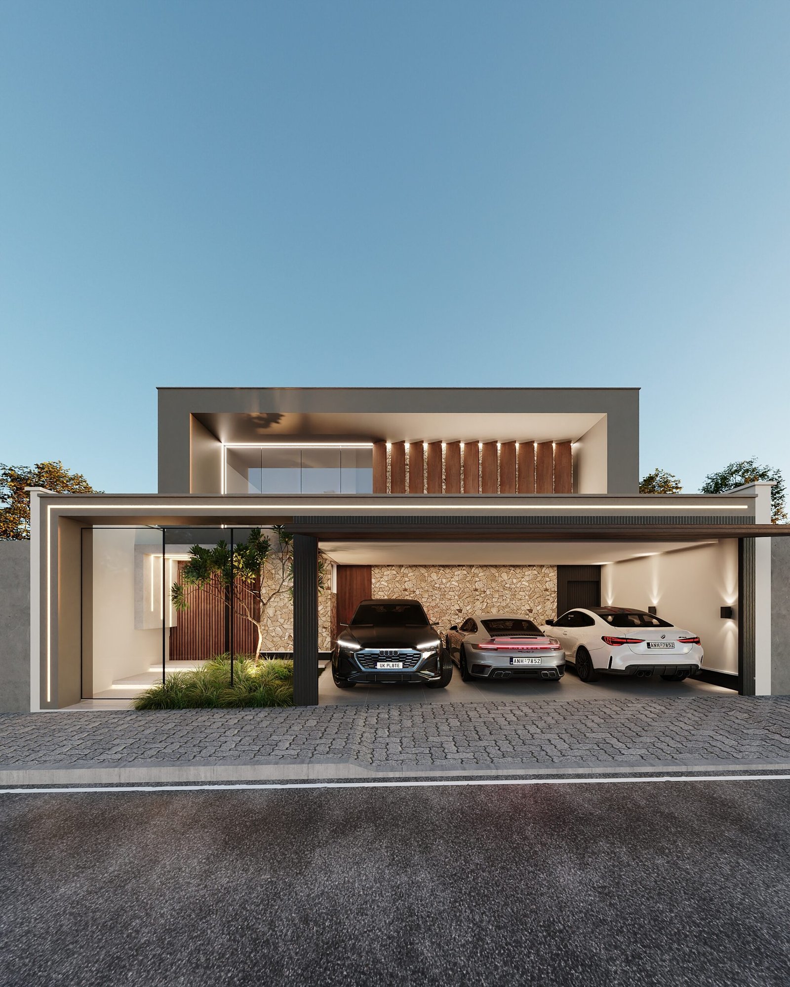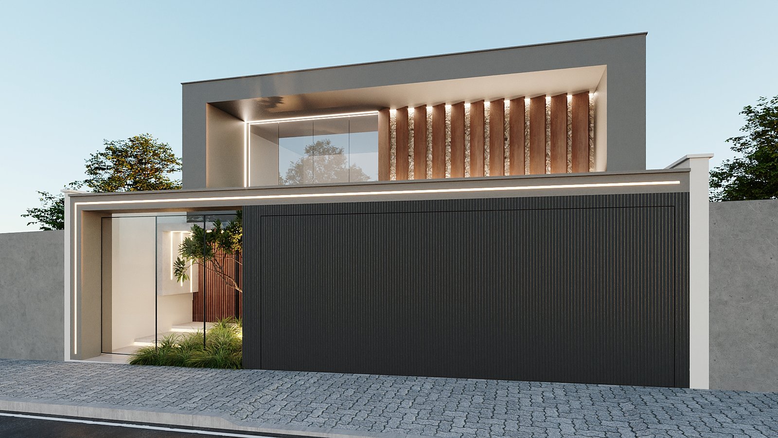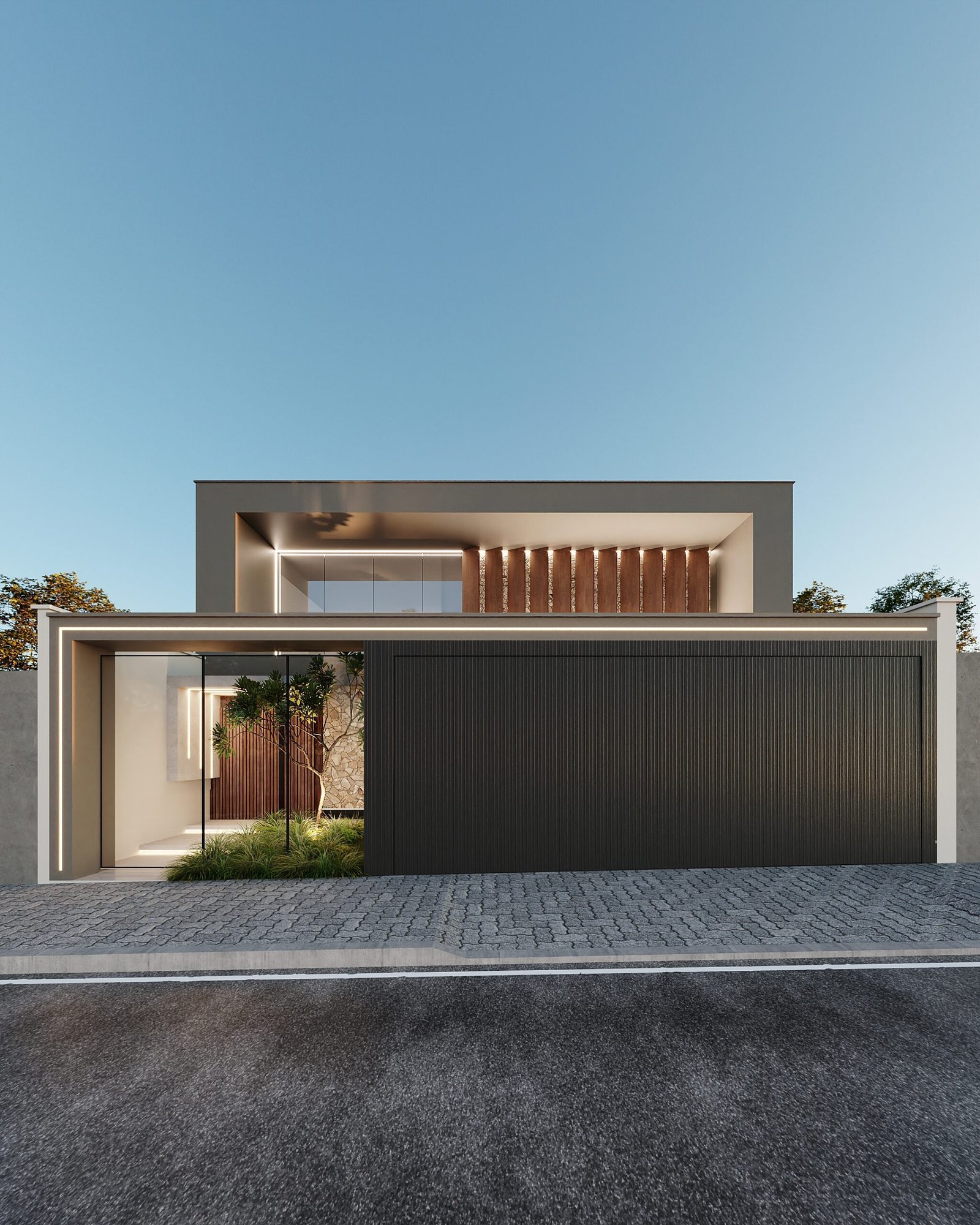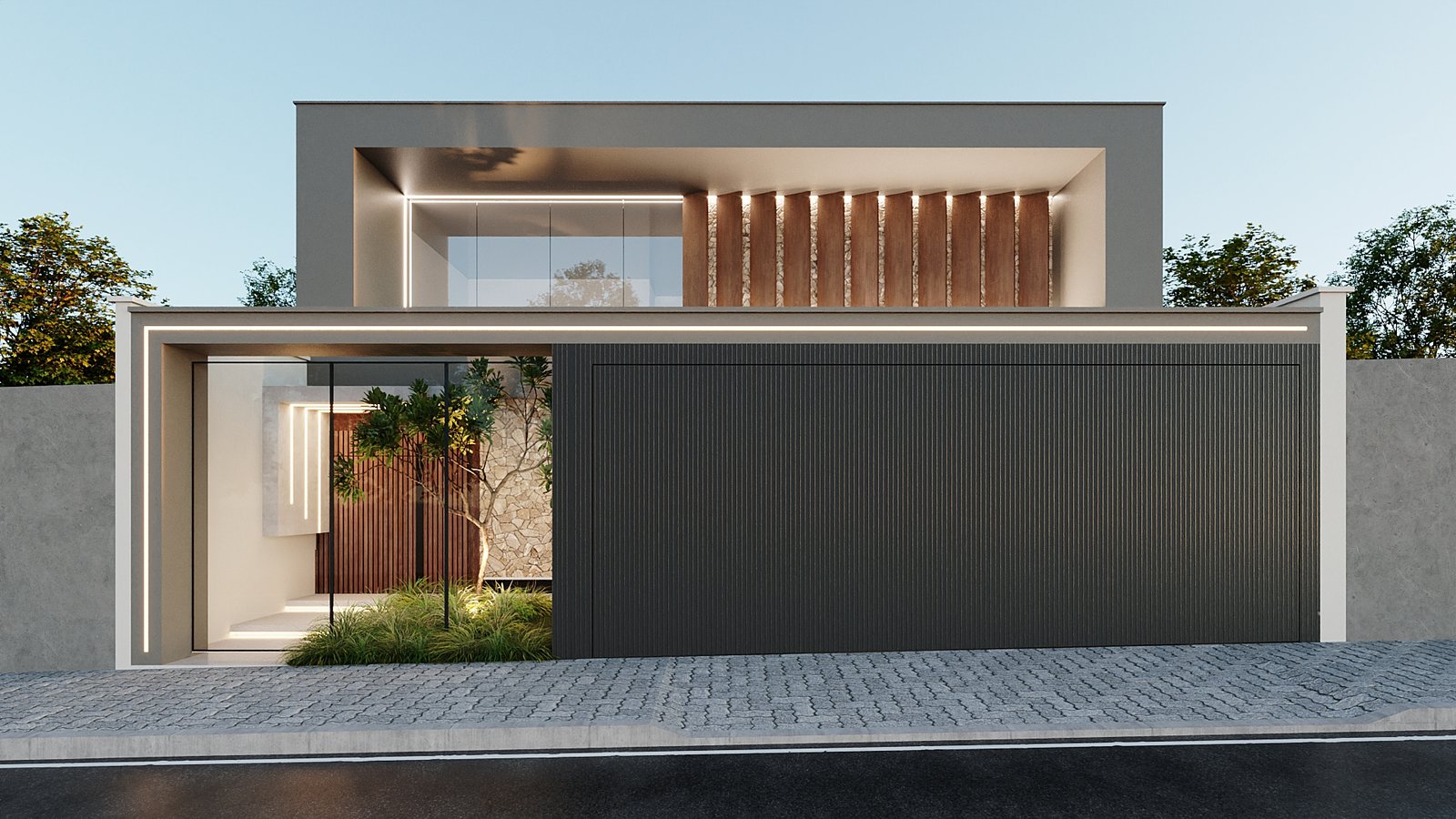 Neste projeto em execução, a composição de volumes puros e materiais naturais cria uma fachada de presença imponente e atemporal.