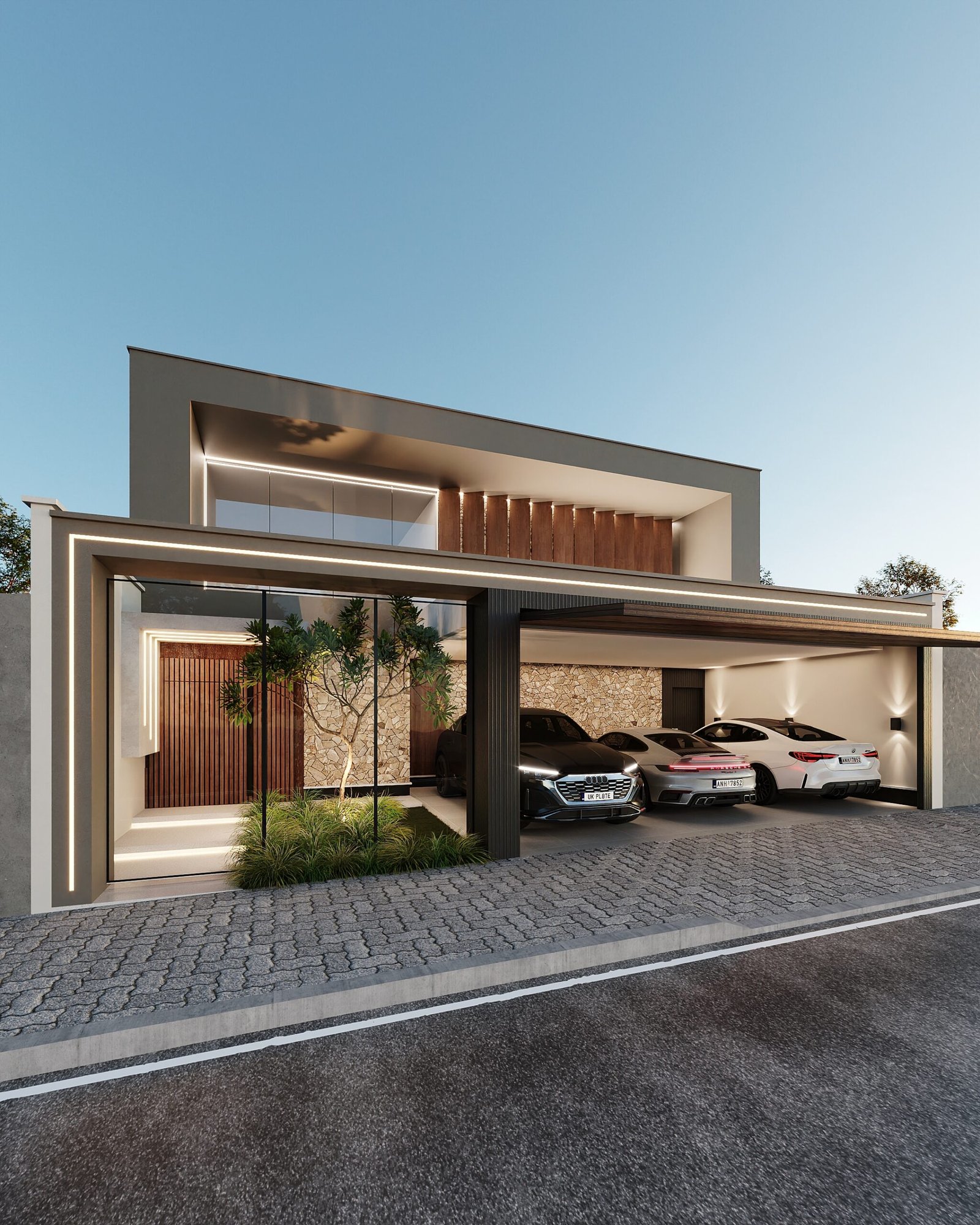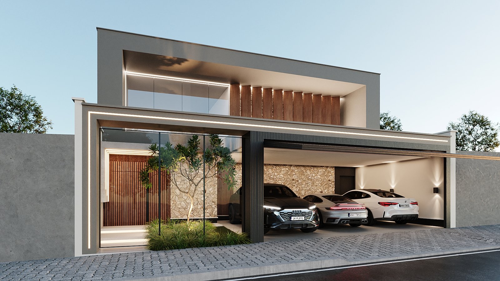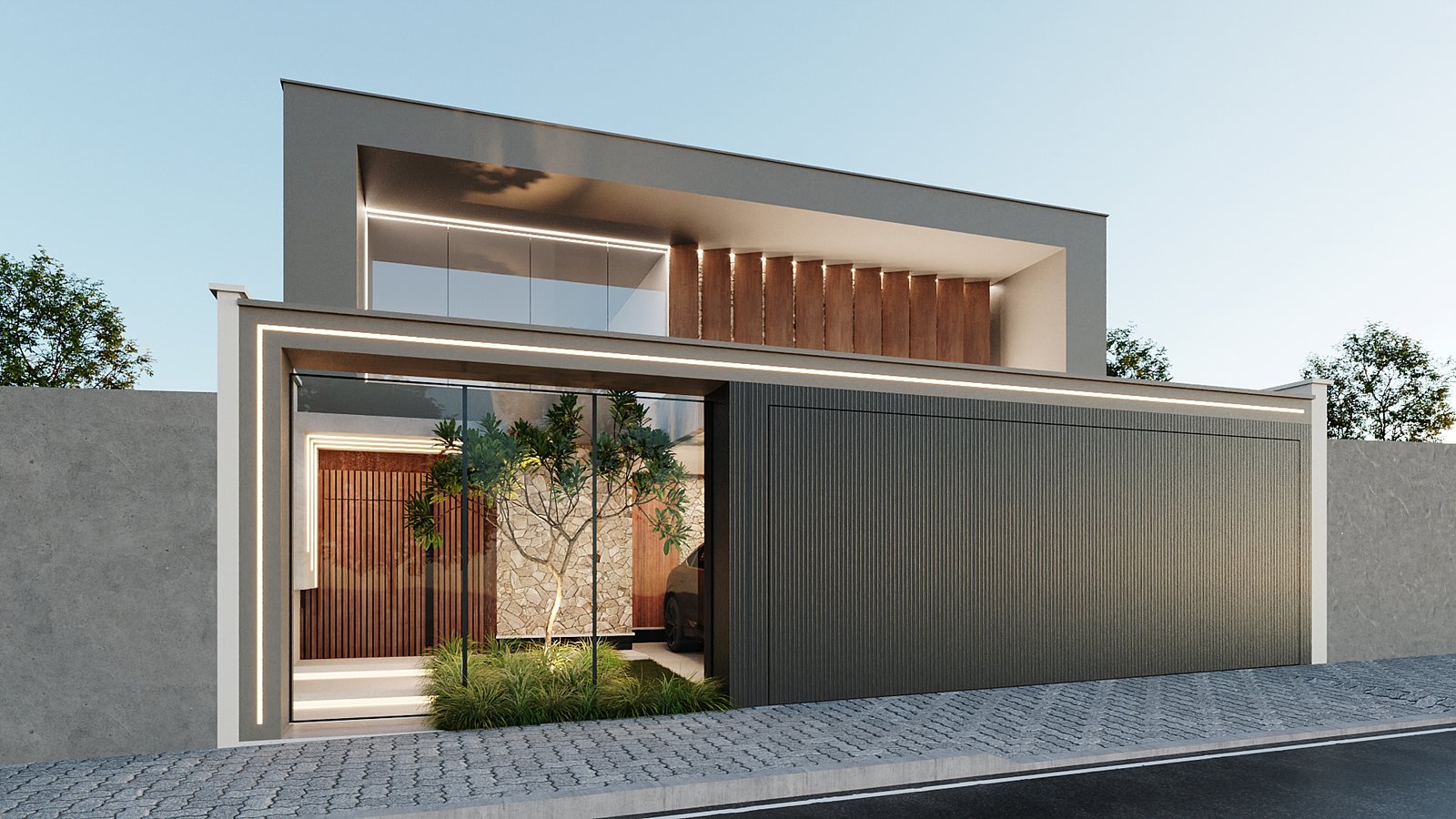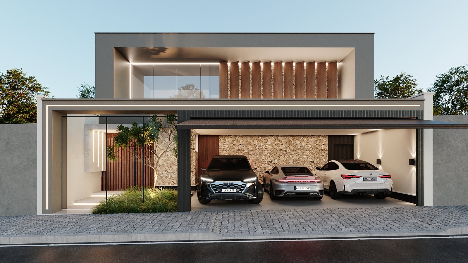 Neste projeto em execução, a composição de volumes puros e materiais naturais cria uma fachada de presença imponente e atemporal.