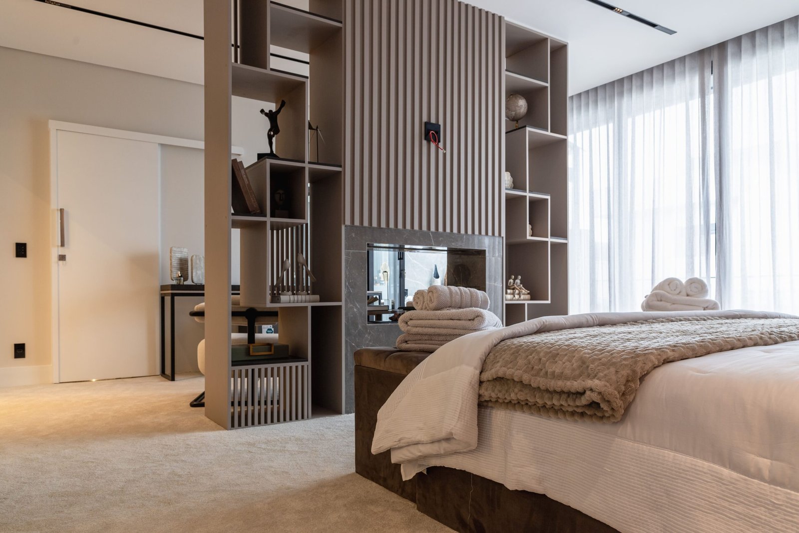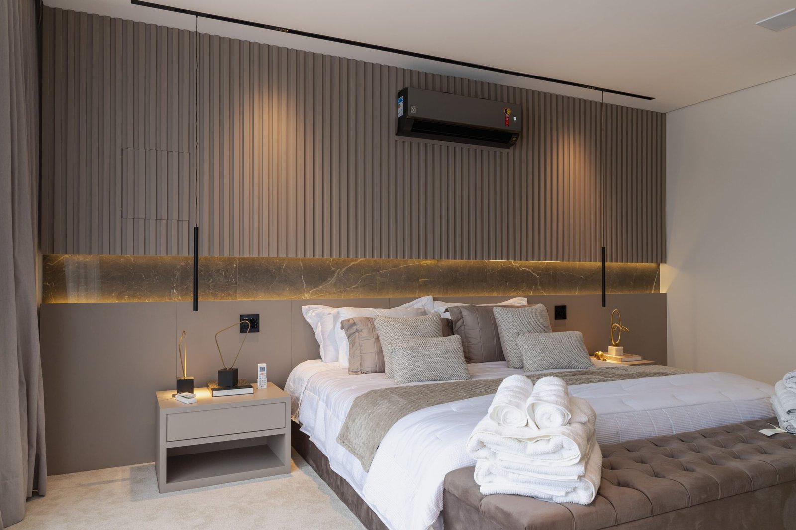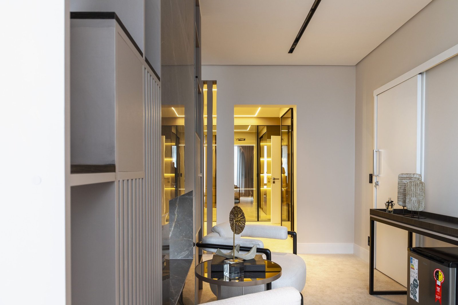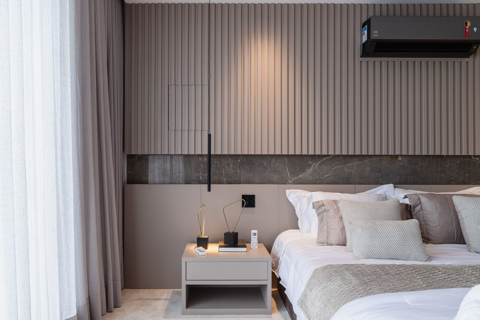 Texturas suaves, iluminação intimista e mobiliário integrado revelam uma estética contemporânea que valoriza o essencial: bem-estar, conexão e leveza