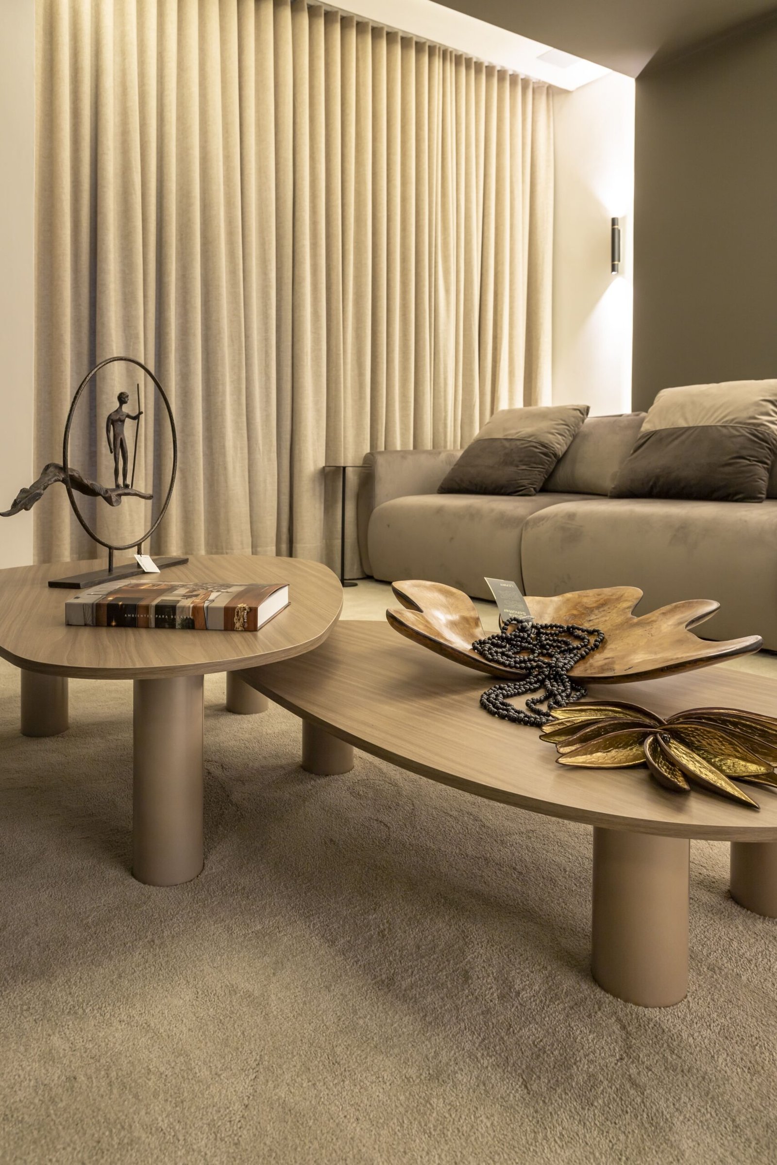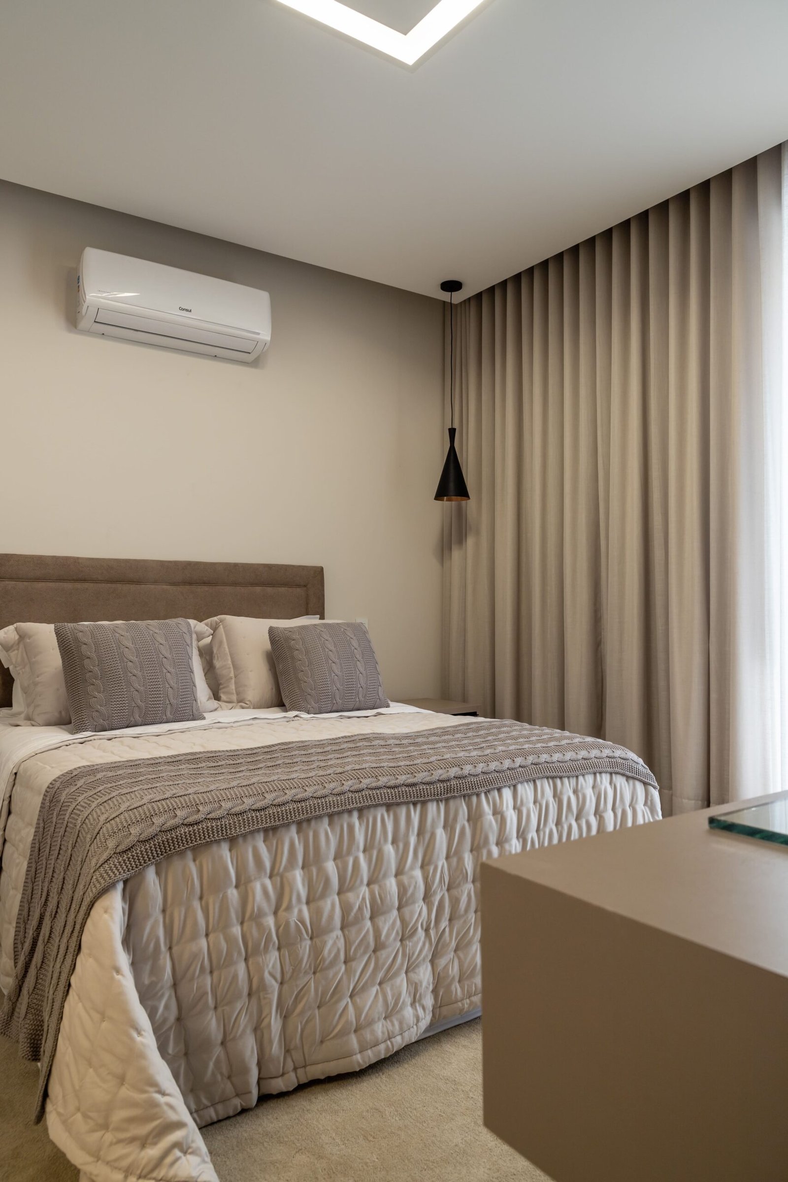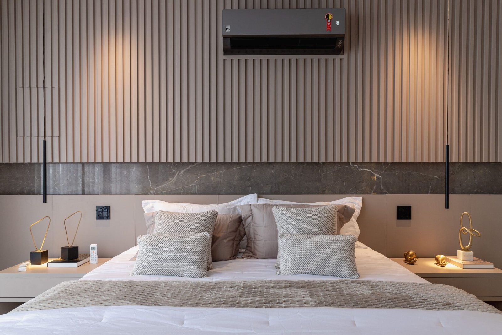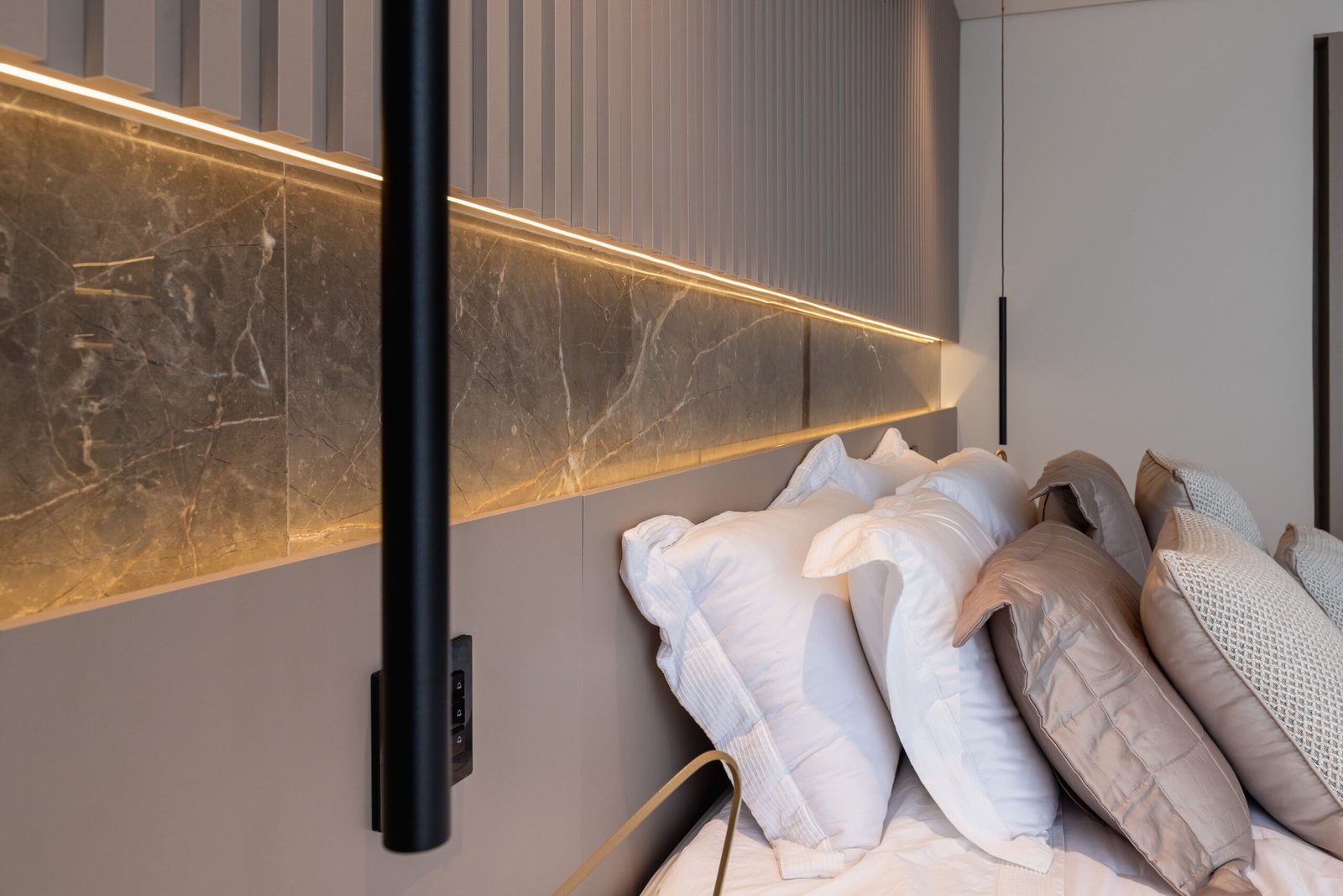 Texturas suaves, iluminação intimista e mobiliário integrado revelam uma estética contemporânea que valoriza o essencial: bem-estar, conexão e leveza